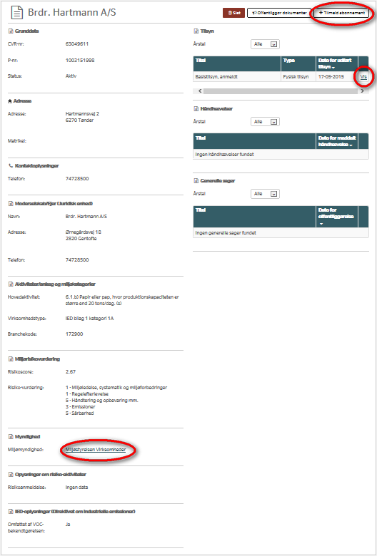 Du kan tilmelde dig et abonnement på nyheder (ændringer i registreringer) om virksomheden/husdyrbruget. Du kan linke direkte til den ansvarlige miljømyndighed, som er den myndighed, der udarbejder virksomhedens miljøgodkendelse og foretager tilsyn. Du kan også se, hvornår der senest er sket en opdatering i virksomhedens oplysninger. |